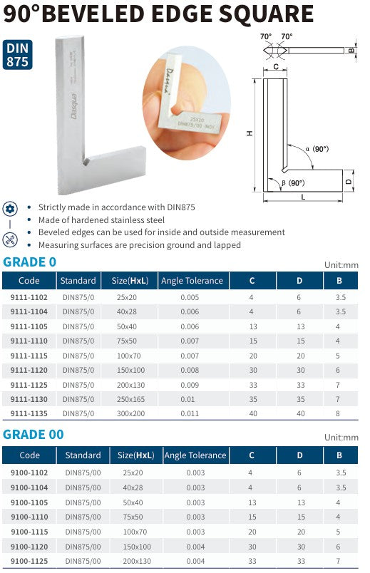 A precision 90‑degree beveled‑edge square built for layout, inspection, and machine‑shop accuracy work. The hardened stainless‑steel body provides long service life, and the satin‑chrome finish gives low‑glare readability on the reference faces. The beveled edges allow both inside and outside measurement, and all measuring surfaces are precision‑ground and lapped for smooth, repeatable contact. Manufactured strictly to DIN 875 standards, available in both Grade 0 and Grade 00 for workshop or inspection‑room accuracy.