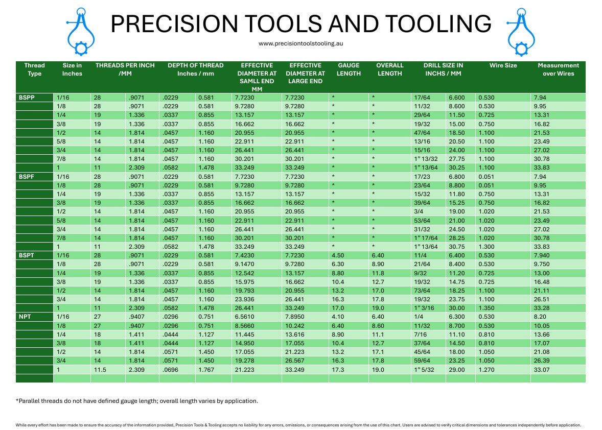 To a free full size copy of our pipe thread chart, please email us at slaes@precsiontollstooling.au and we will reply with a A3 printable PDF version.